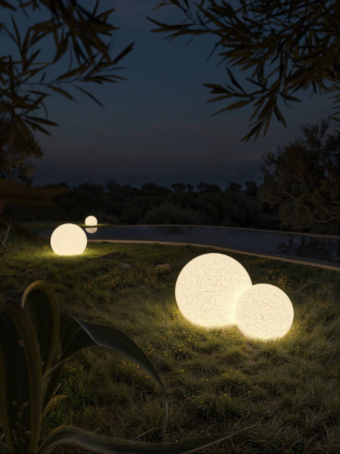 Cisne outdoor ball fixture is made of polycarbonate with a methacrylate diffuser so that the LED light evenly illuminates the Cisne.